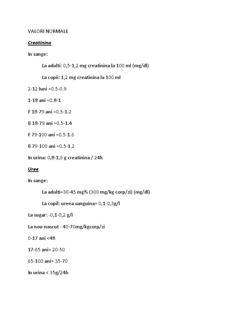 vizitati articolul complet aici : 2 Iata o lista cu valorile normale ale analizelor uzuale de sânge si urina. I valori indicati sul referto dalla clearance 24h del 03/06 us inclusi quelli che per fretta avevo saltato. Quali sono i valori normali della creatinina?