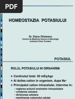 Scaderea potasiului in sange este numita si hipopotasemie reprezinta un nivel scazut al potasiului potasiul este un element mineral care se gaseste aproximativ 98% intracelular si 2% extracelular. Deficitul de potasiu la animale, inclusiv omul, conduce la numeroase disfuncții neurologice. Potasiul nu este insa un tratament curativ si nici preventiv pentru bolile.