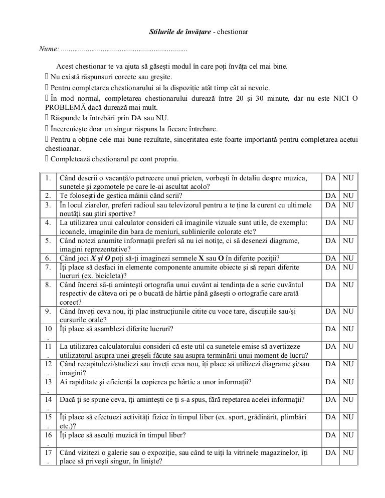 vizitati articolul complet aici : https://docs.google.com/spreadsheet/viewform?key=0AmK2d9xJgROddEJYYl9keEVFamMxSWhDOFh3bVlMQWc 8cnd ncercai s v amintii ortografia unui cuvnt, avei tendina de a scrie cuvntul respectiv de cteva ori pe o bucat de hrtie pn cnd gsii o ortografie care arat corect?danu. Elevii prefera experientele de invatare in care sunt activ implicati, astfel ei vor obtine rezultate mai bune si vor avea succes la scoala. Chestionar stiluri de învăţare alegerea strategiei în concordanţă cu stilurile de învăţare.