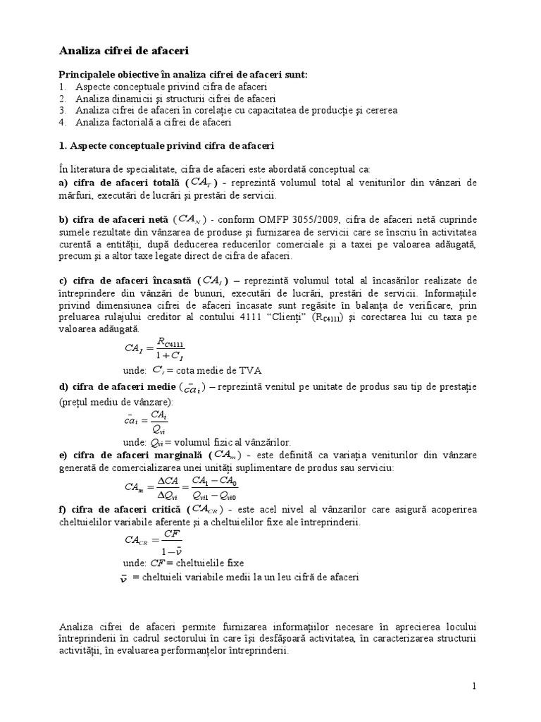 C) coroborate cu cele ale art. Cifra de afaceri (ca) reprezintă totalul vânzărilor realizate (facturate) pe parcursul unui exercițiu fiscal. Spre exemplu, cifra de afaceri critica reprezinta acel nivel al incasarilor care acopera doar cheltuielile fixe si variabile, compania respectiva fiind la un.