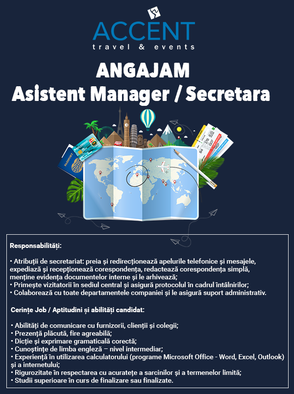 Agenția de turism accent travel & events caută asistent manager / secretară care să se alăture echipei în sediul central situat pe șoseaua mihai bravu nr.